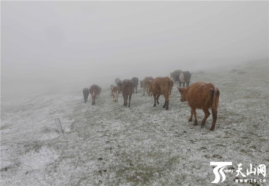 天山网讯(特约记者巴合提别克摄影报道)5月14日,新疆阿勒泰地区喀纳斯景区迎来降雪天气,马牛羊在已经泛绿的草原上吃草,含苞待放的花朵被雪覆盖,露出尖尖角,甚是美丽。虽时值初夏,喀纳斯景区却刚迎来春天,五月飞雪风光也格外迷人,不少游客为之赞叹。